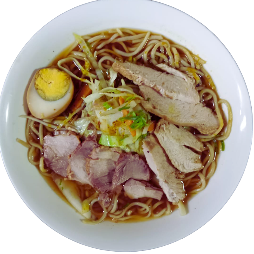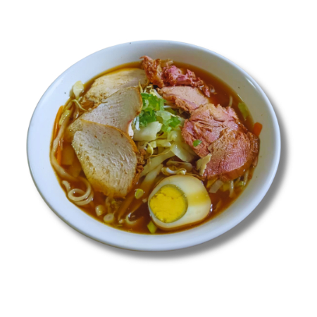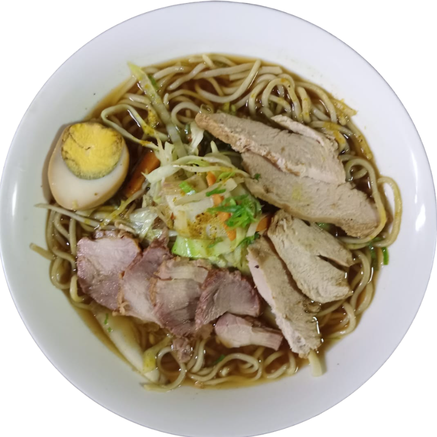 Caldo a base de pollo, cerdo, vegetales de temporada con ajo, ají, jengibre, pasta, pollo y cerdo, huevo y cebollín.