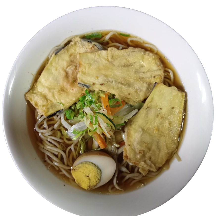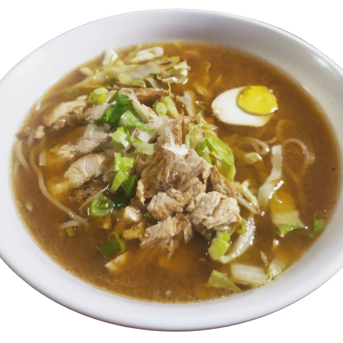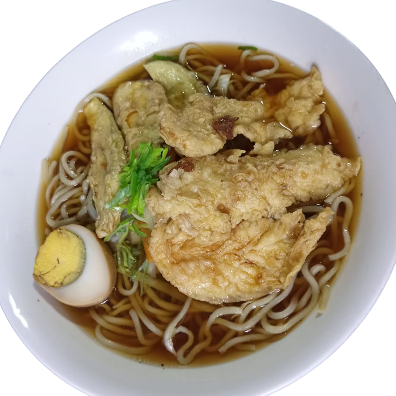Caldo a base de pollo, cerdo y vegetales de temporada, pasta, cerdo empanizado, huevo y cebollín.