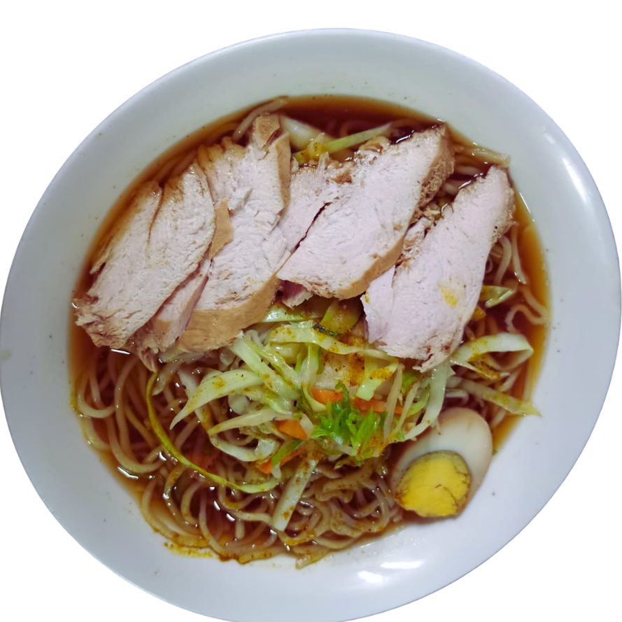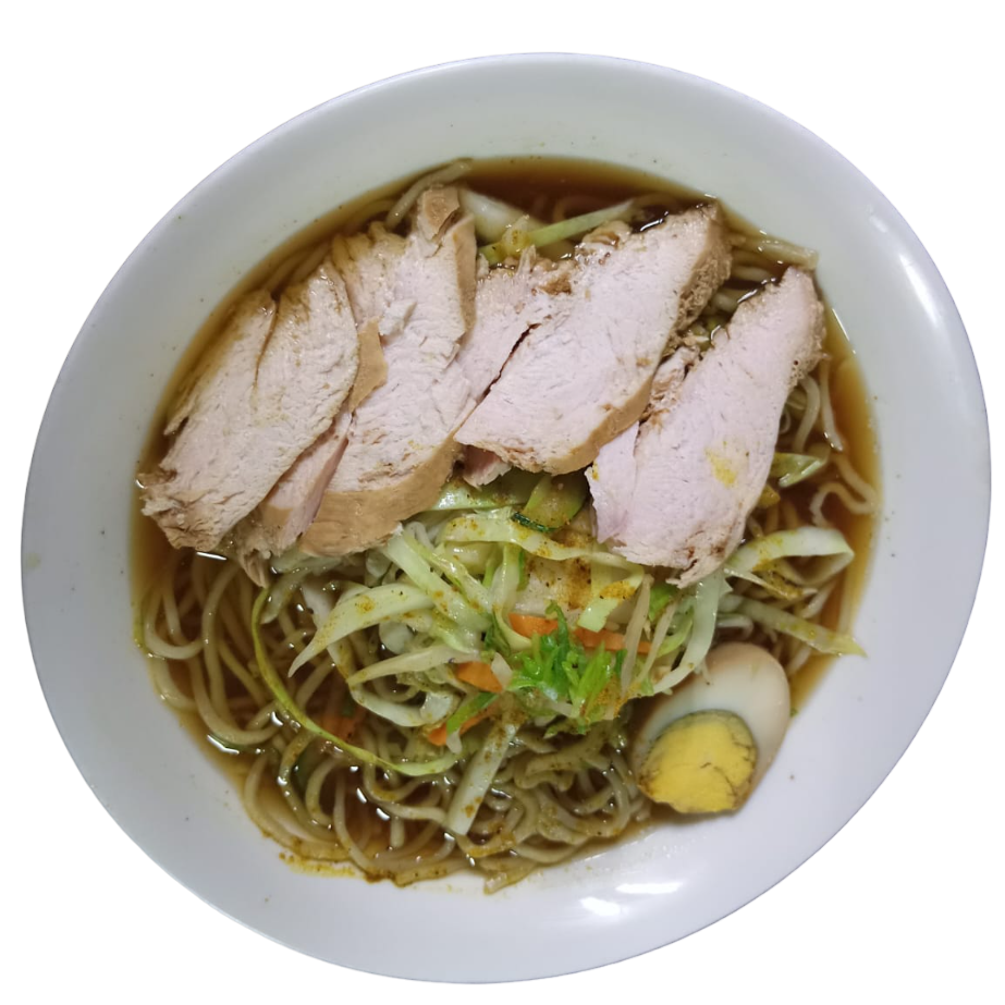 Rico caldo a base de pollo, cerdo y vegetales de temporada, curry picante, con pastas cocidas, cebollín, huevo y pollo.