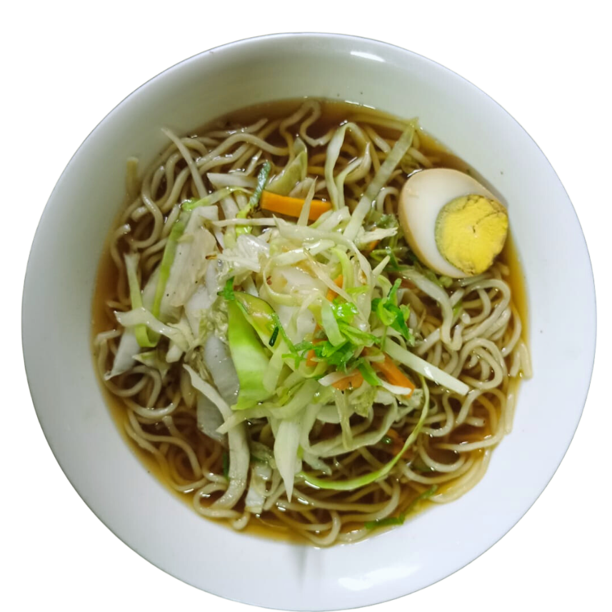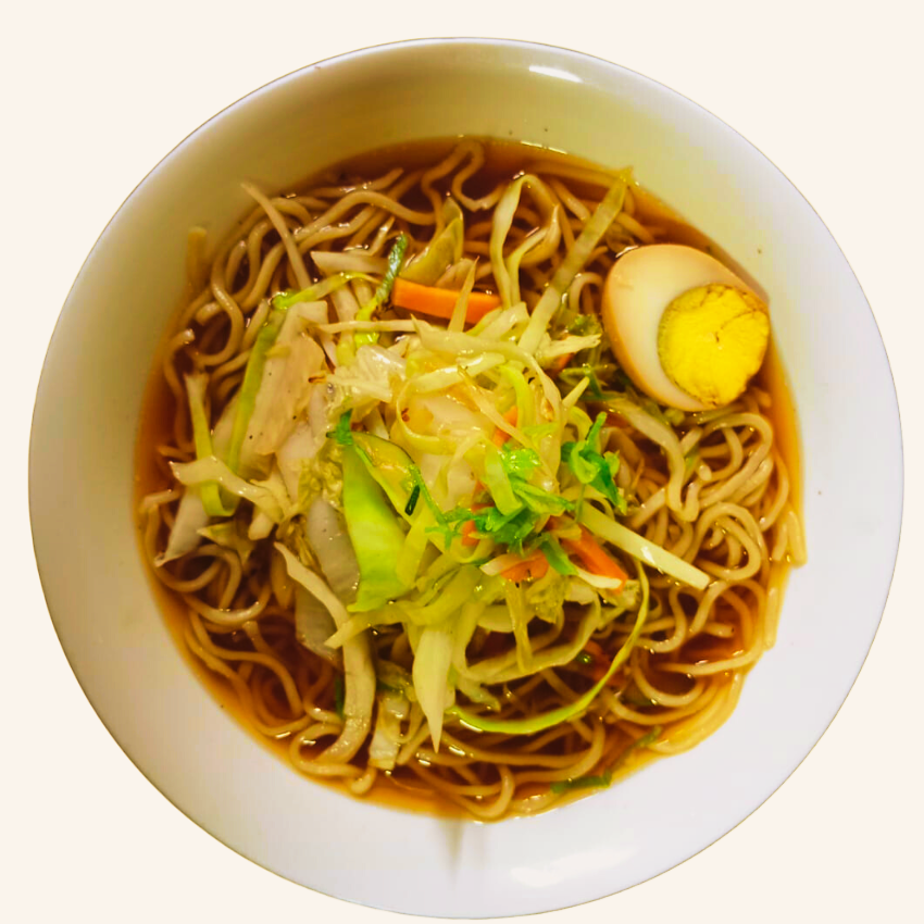 Rico caldo a base de pollo, cerdo (3 a 4 rebanadas) y vegetales de temporada, con pastas cocidas, cebollín y huevo. (Tamaño mediano)