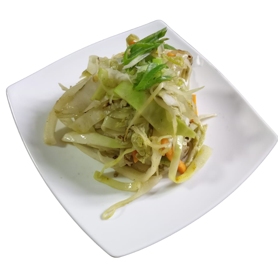 Pastas salteadas con soya, vegetales de temporada, huevo, pollo y cerdo.