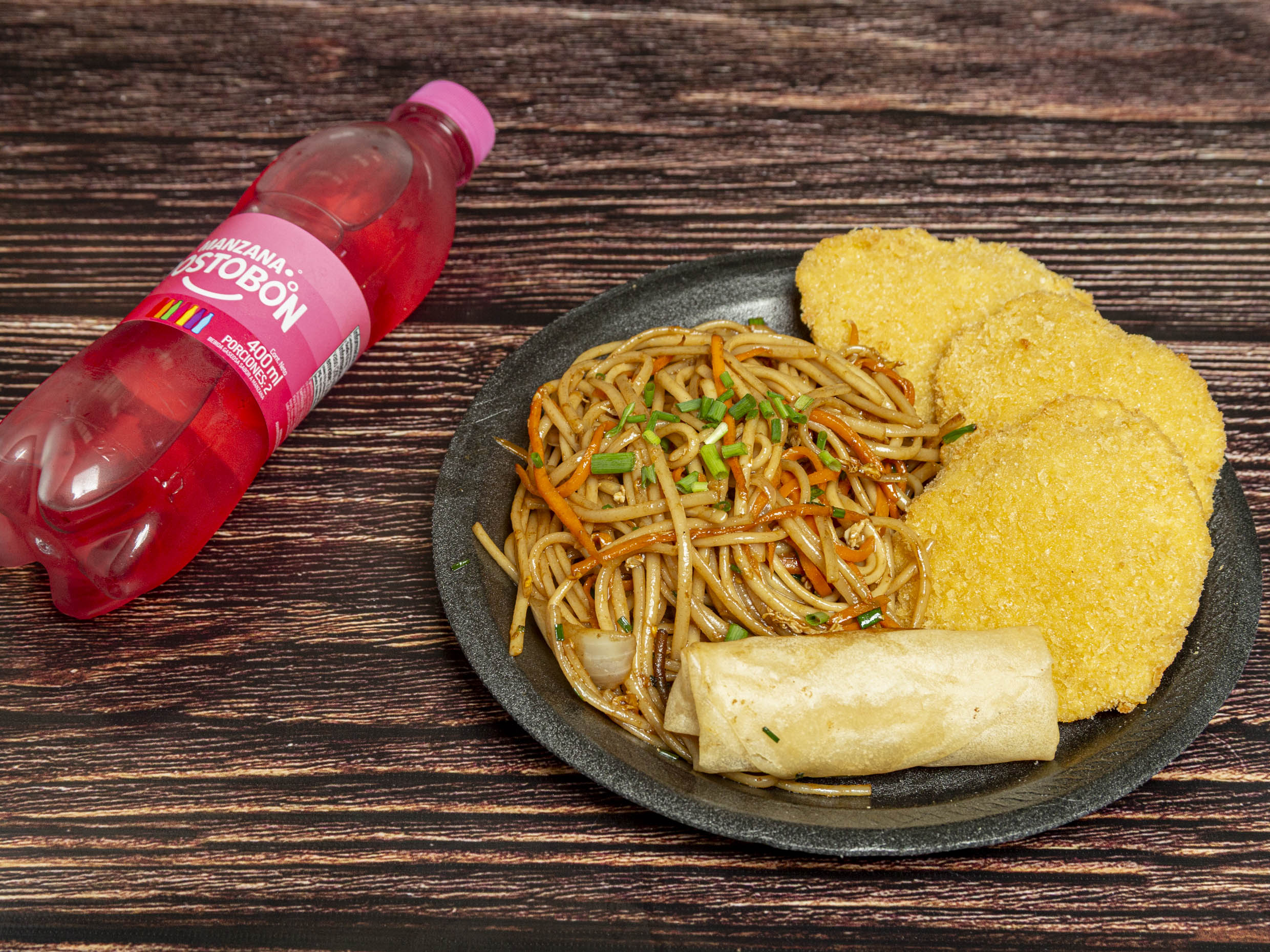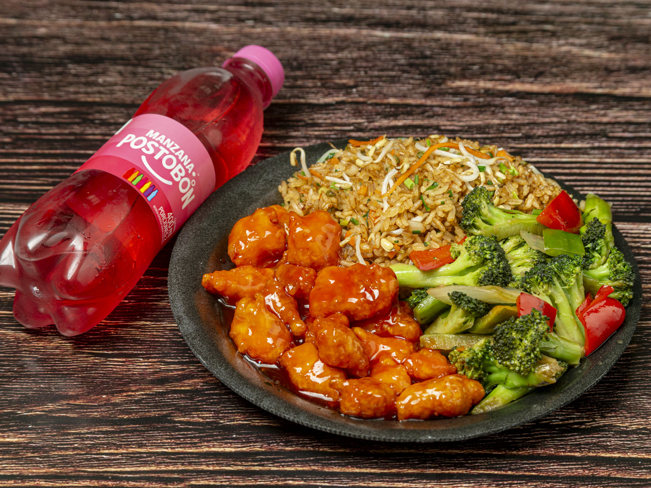 Arroz, vegetales, lumpias, pollo agridulce y gaseosa 1.5 L.