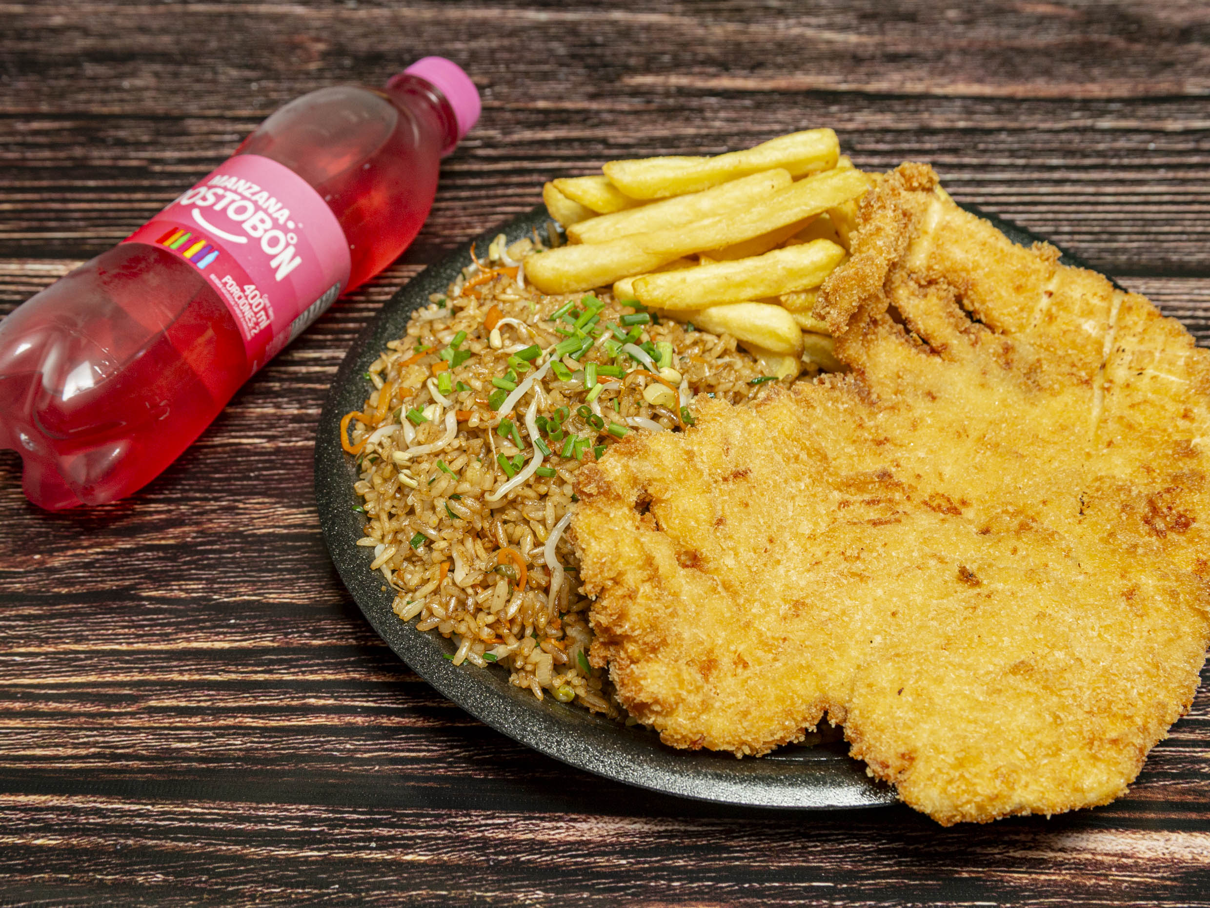 Arroz, vegetales, papas fritas, chuleta y 1 gaseosa 1.5 L.