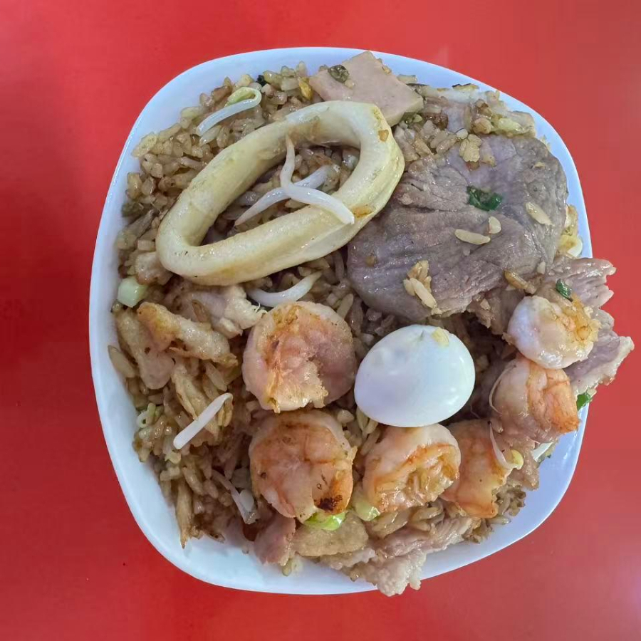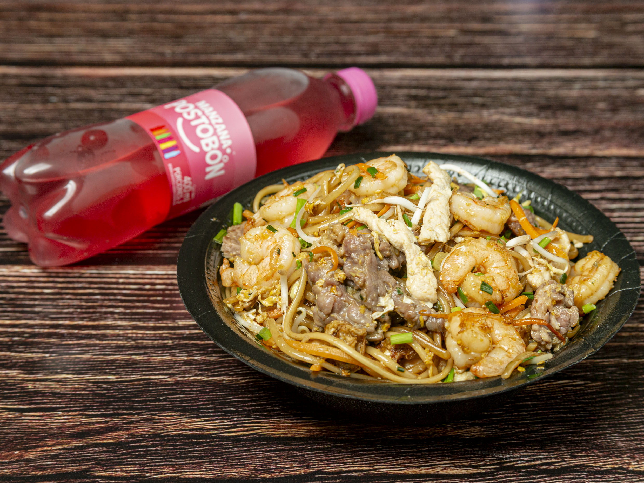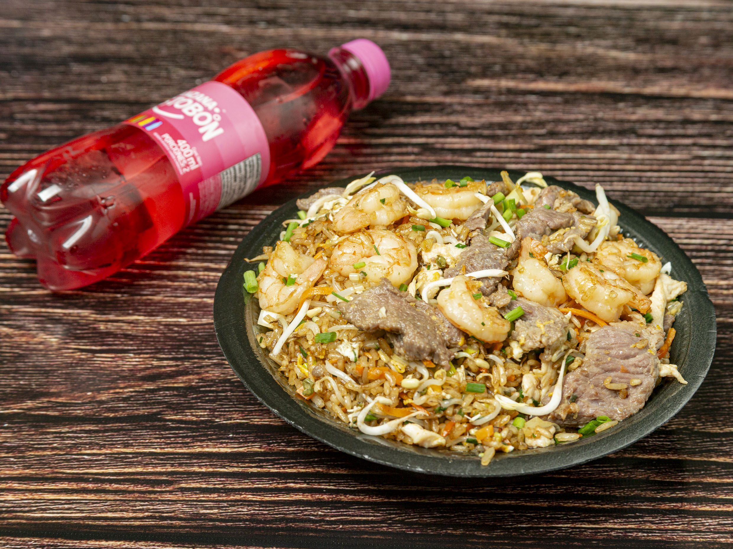 Arroz, pollo, res, camarón y bebida (1 persona).
