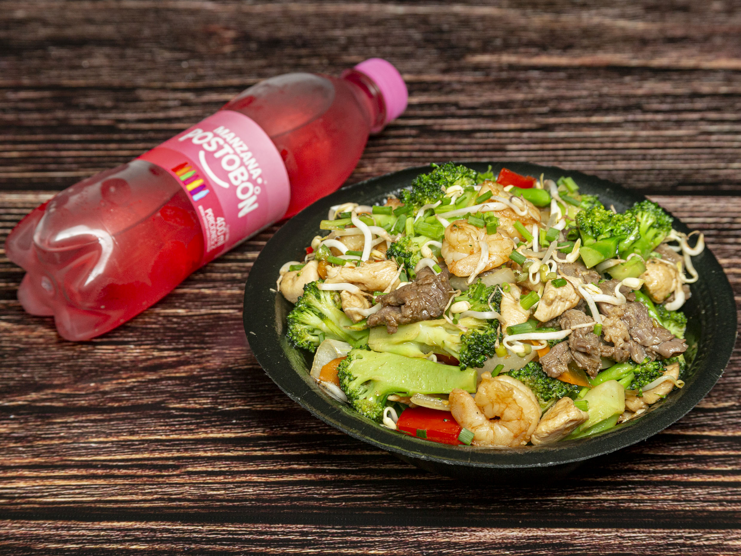 Brócoli, coliflor, cebolla, pimentón, res, pollo, camarón y bebida (1 persona).