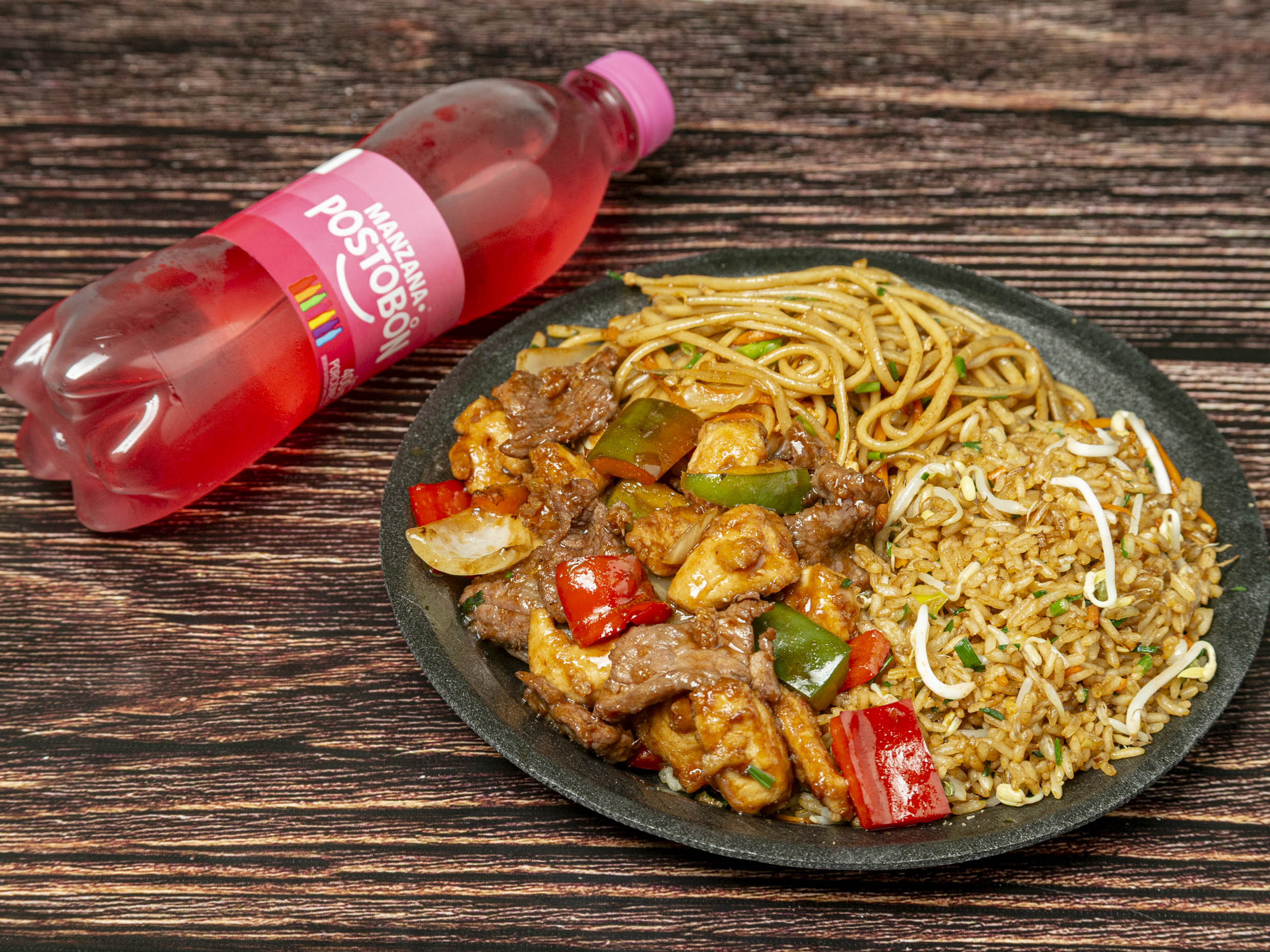 Arroz, pasta, gongpao mixto y bebida.