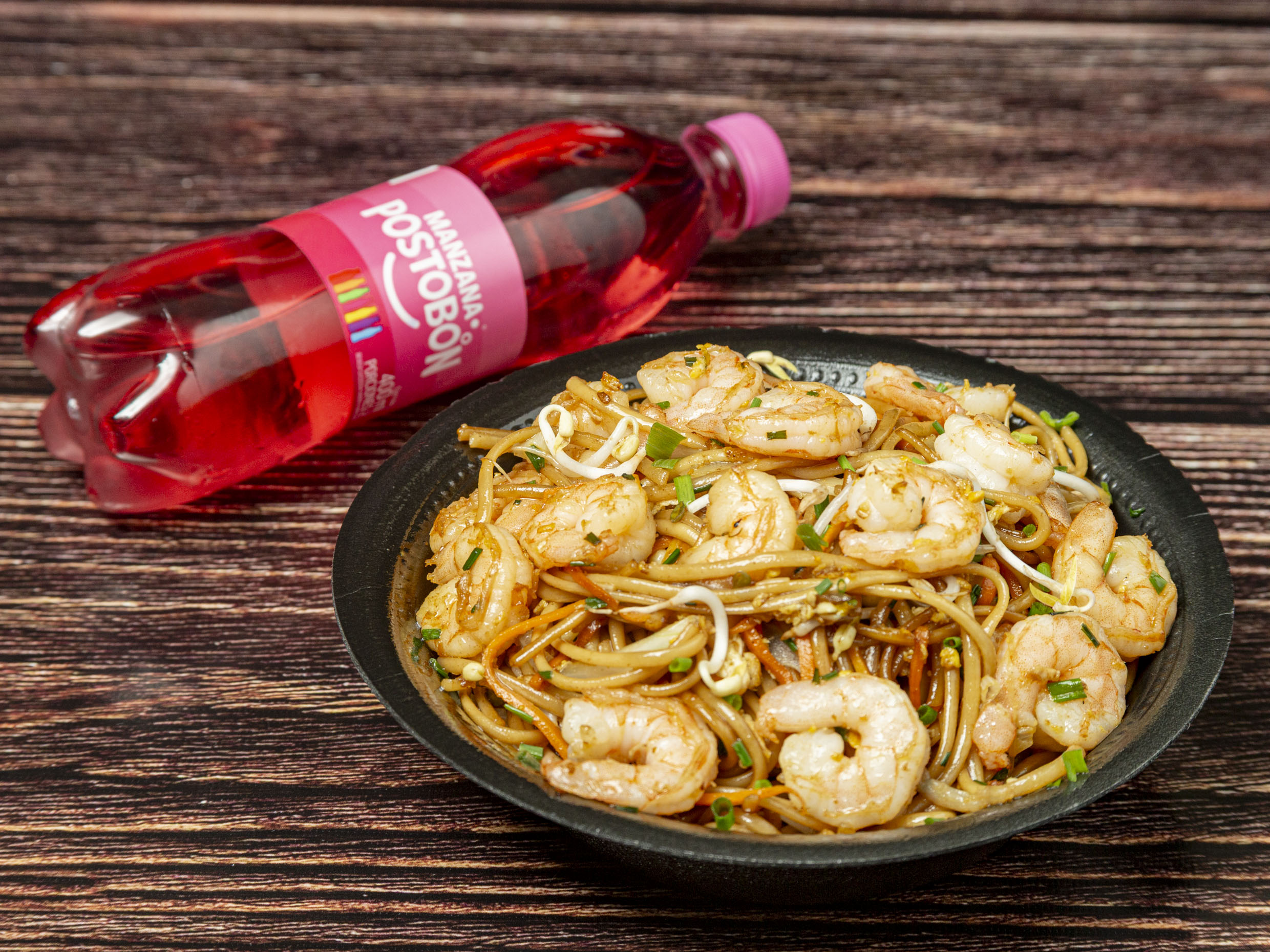 Pasta más 23 camarones y bebida (1 persona).