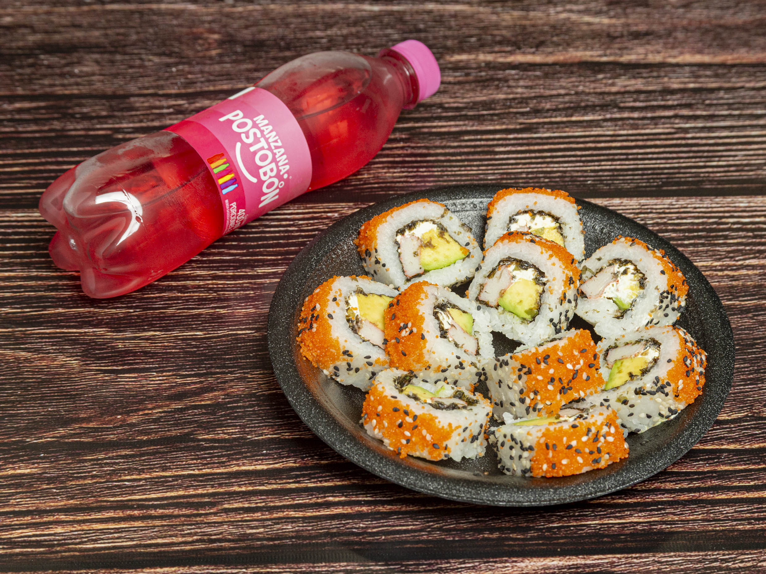 Palmito, masago, aguacate, queso crema y bebida.