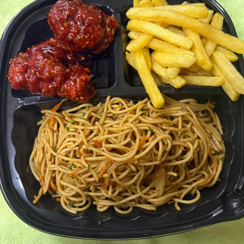 Arroz, vegetales, papas fritas, alitas y 2 bebidas.