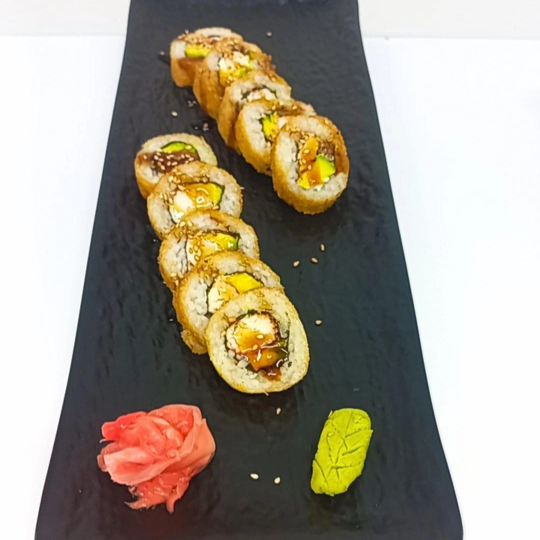 roll relleno de plátano maduro, tilapia apanada y queso crema con topping de aguacate.