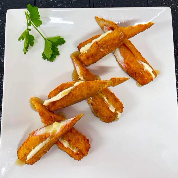 palitos de cangrejos apanados en queso parmesano, rellenos de queso crema y bañados en salsa miel jenjibre.