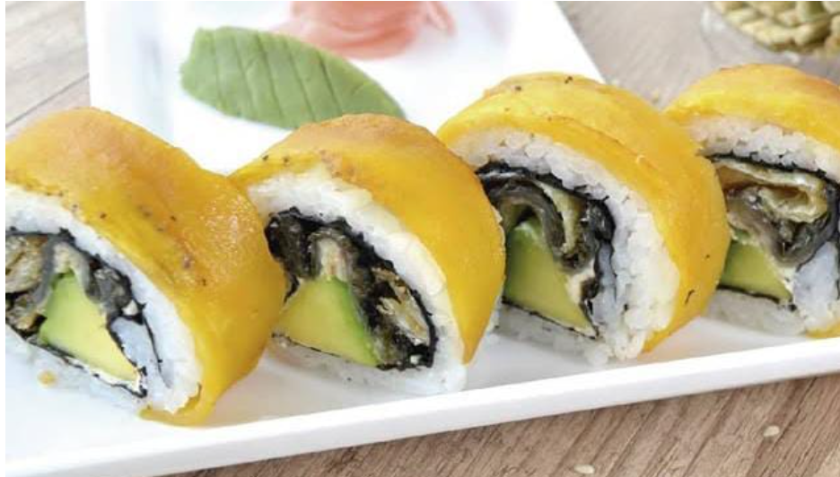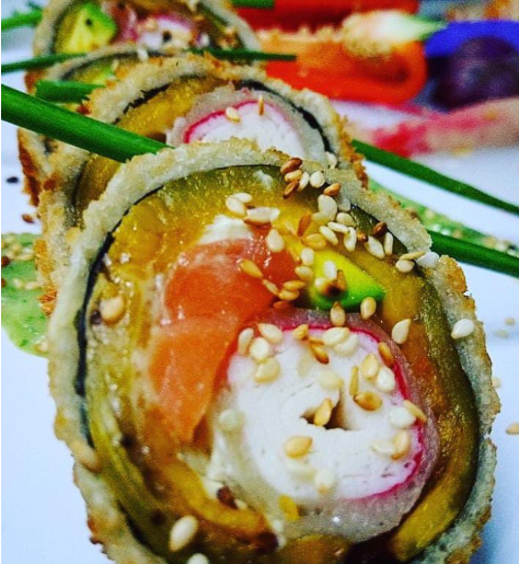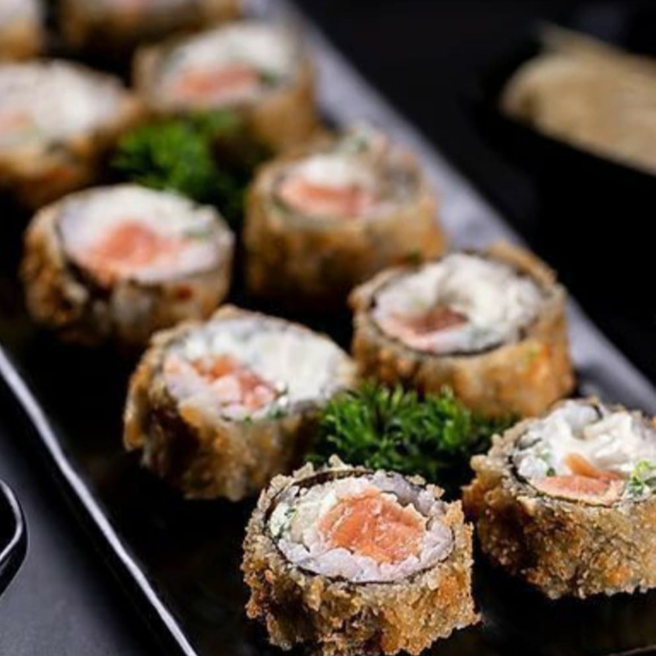 10 Bocados arroz de sushi pollo apanado plátano, queso crema, topping de ajonjolí y salsa Fuji.