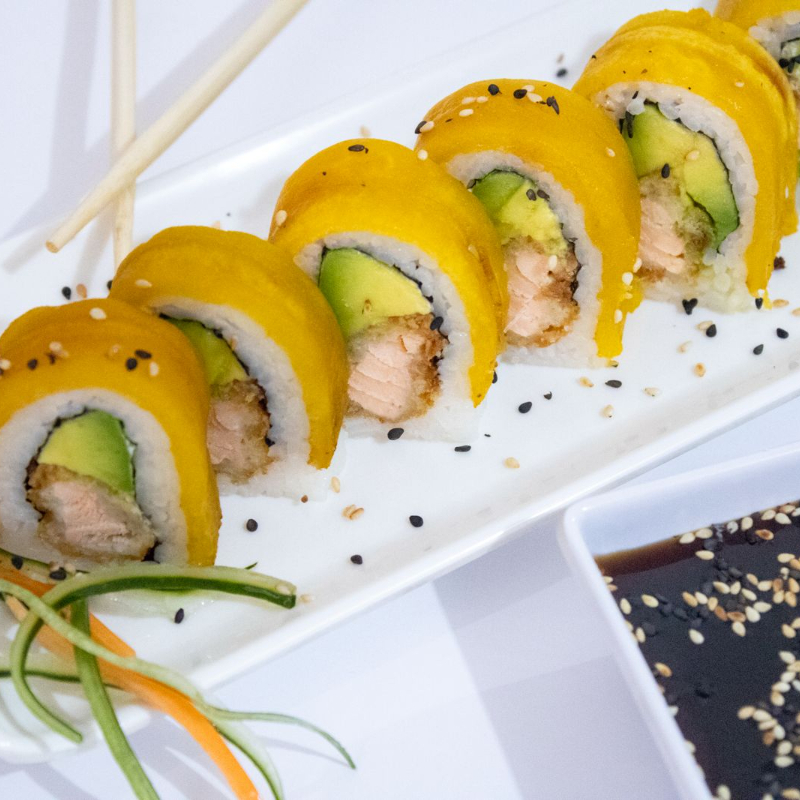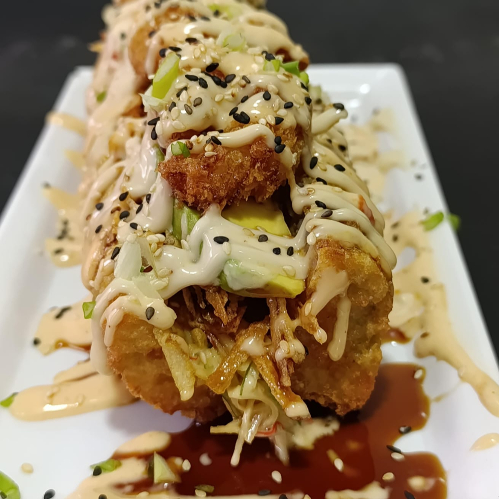 arroz alga nori queso crema platano pasta dinamita yuca crocante camarones apanado cebollin salsa dinamita salsa teriyaki y salsa fuji