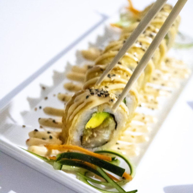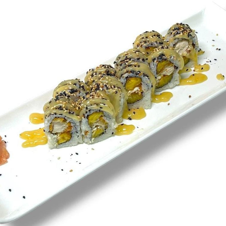 10 Bocados arroz de sushi aguacate, tilapia apanada, queso crema, topping de gratinado de camarones con salsa dinamita teriyaki y cebollín.