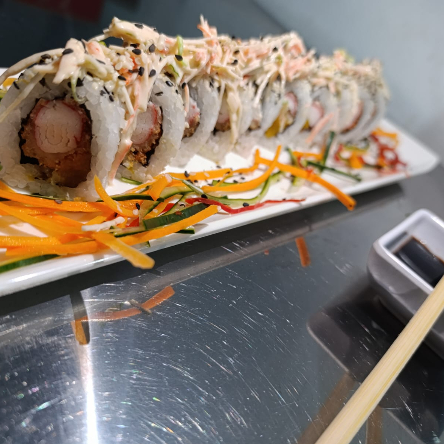 Arroz alga nori queso crema tilapia apanada aguacate gratinado de camarones y salsa fuji