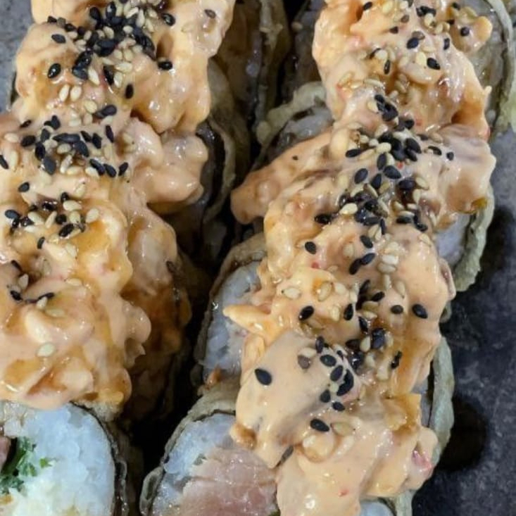 10 uds con salsa dinamita, cebollín y ajonjolí.