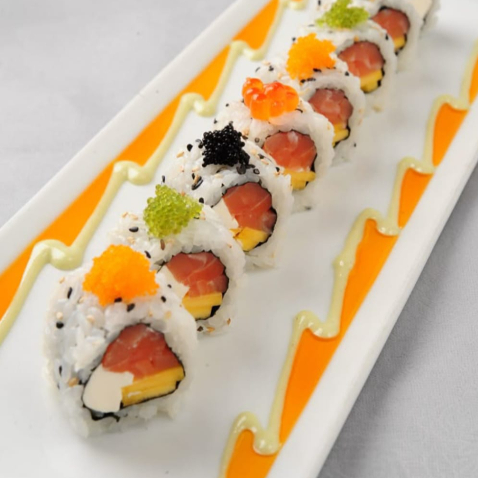 10 Bocados arroz de sushi mango, queso crema, salmón fresco y topping de ajonjolí.