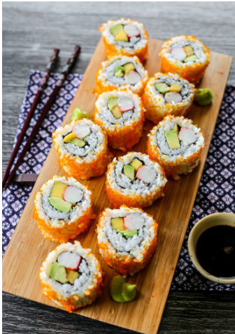 10 Bocados, arroz de sushi, salmón fresco, atún fresco, kanikama, aguacate y topping de masago.