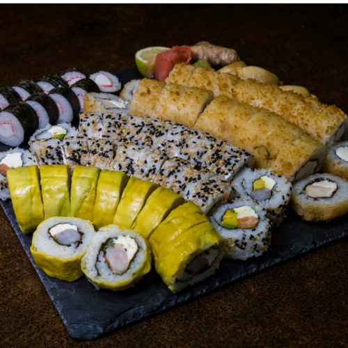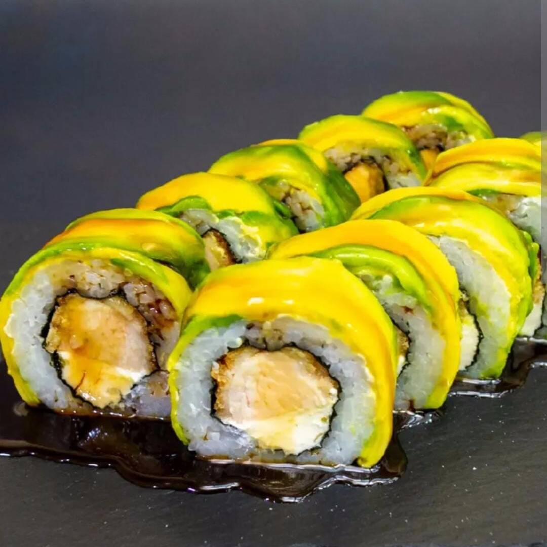 roll relleno de pesacado blanco apanado, maduro, aguacate y queso crema. con topping de platano y aguacate.