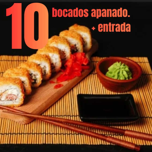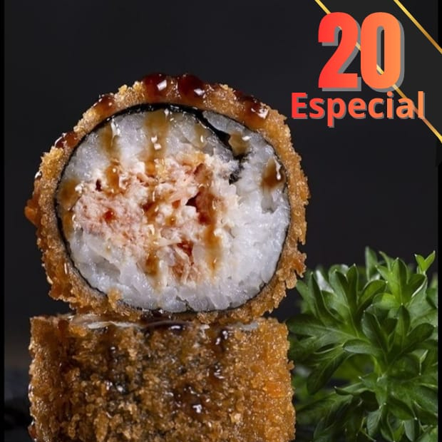 Rollo con camarón apanado, plátano frito, queso crema, palmito, 10 bocados.