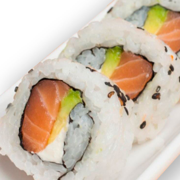 10 Bocados arroz de sushi queso crema, salmón fresco, aguacate y topping de ajonjolí.