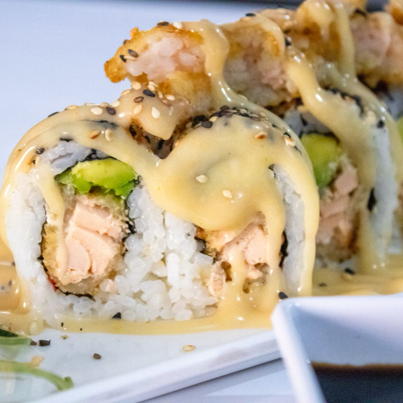 Arroz de sushi salmón fresco, queso crema, aguacate, topping de ajonjolí con pasta dinamita.