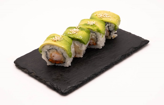 10 Bocados rellenos de palmito apanado, aguacate, pepino con topping de aguacate.
