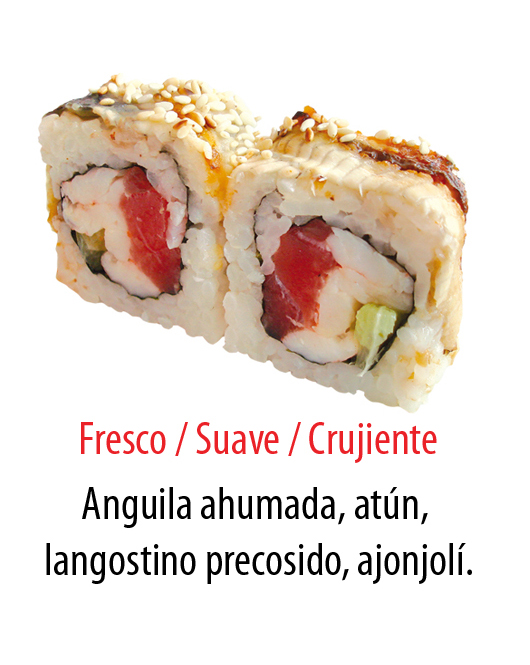 Fresco, suave, crujiente. Anguila ahumada, atuún, langostino precocido, ajonjolí.
