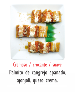 Cremoso, crocante, suave, palmito de cangrejo apanado, ajonjolí, queso crema.