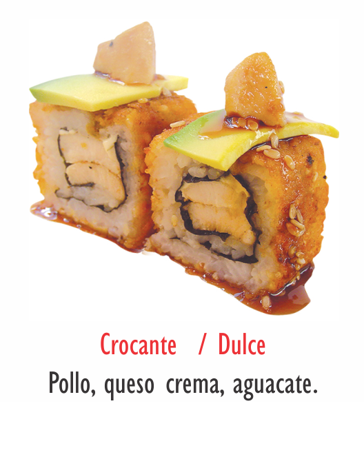 Crocante, dulce, pollo, queso crema, aguacate.