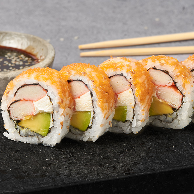 Kanikama, queso philadelphia y aguacate. cubierto con masago caviar. Acompañado con salsa miel de chile y soya.