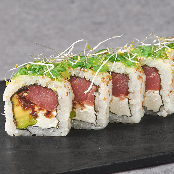 Atún fresco, queso philadelphia, aguacate, puerro caramelizado y cubierto con ensalada de algas. Acompañado con salsa miel de chile y soya.