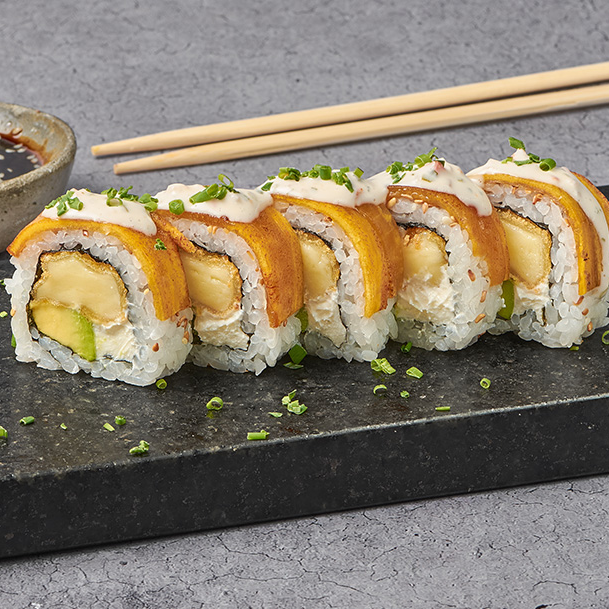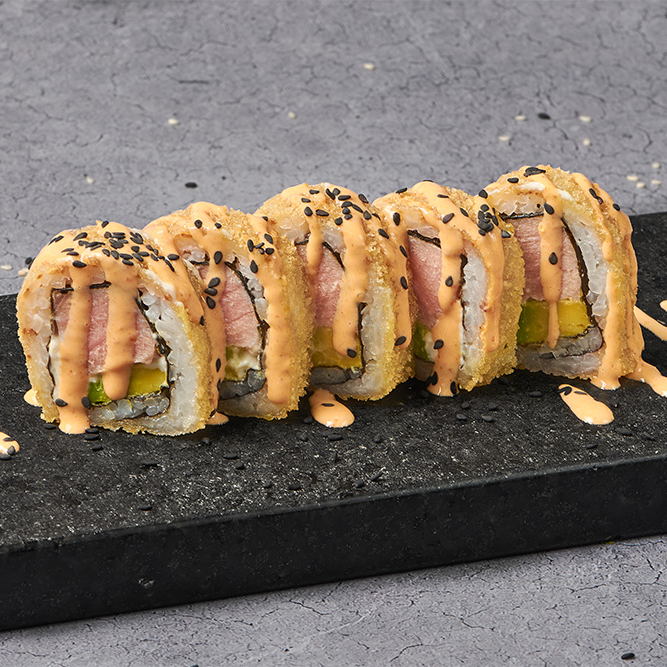 Sushi apanado, relleno de atún, queso philadelphia y aguacate. Acompañado con salsa espicy mayo.