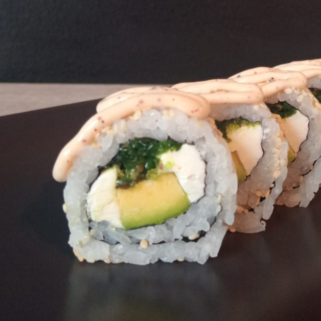 delicioso sushi cremosito relleno con queso philadelphia, ensalada de algas, y aguacate. acompañado con salsa chipotle y salsa de soya