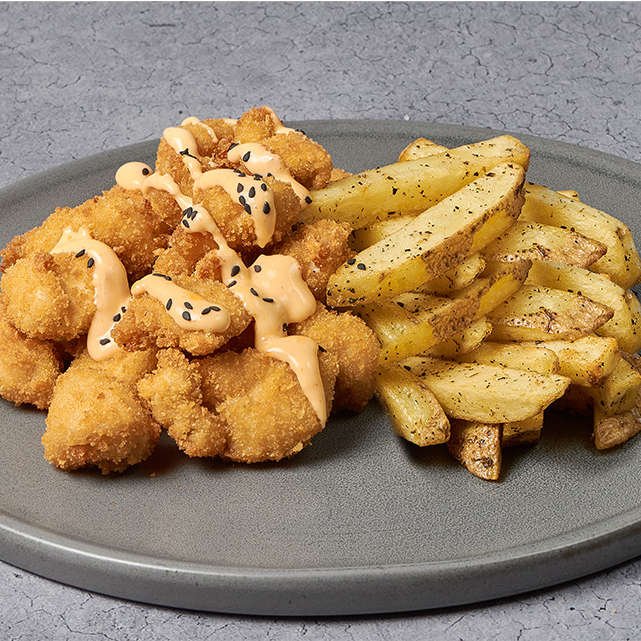 Trozos de pollo apanados acompañados con cascos de papa y salsa de la casa.