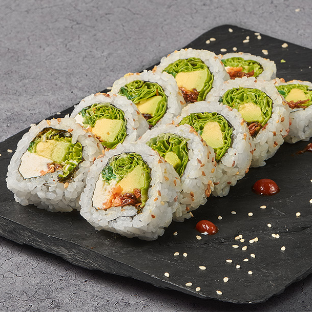 Queso philadelphia, aguacate, lechuga, catzura de zanahoria, puerro caramelizado, ensalada de algas y pepino.