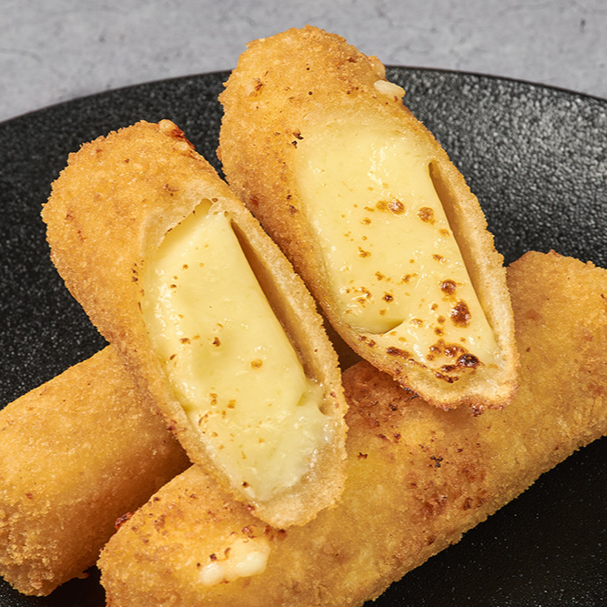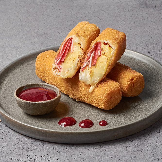 Palitos de queso mozzarella apanados y acompañados con salsa de mora.
