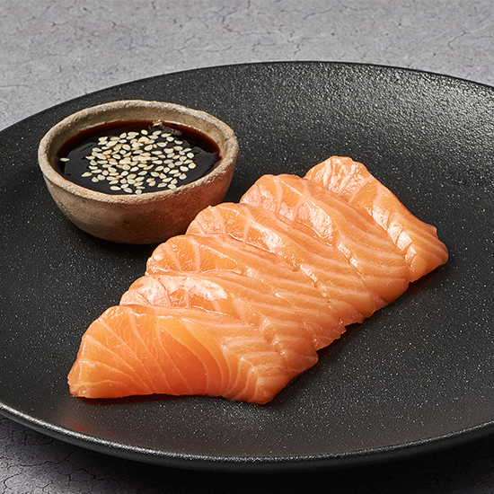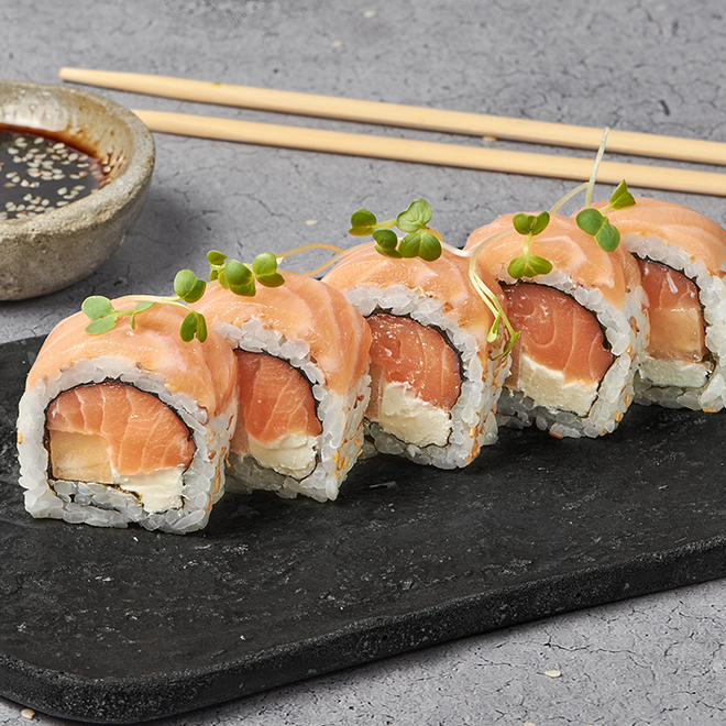 Salmón fresco, queso philadelphia, yacón, cubierto con salmón. Acompañado con salsa miel de chile y soya.