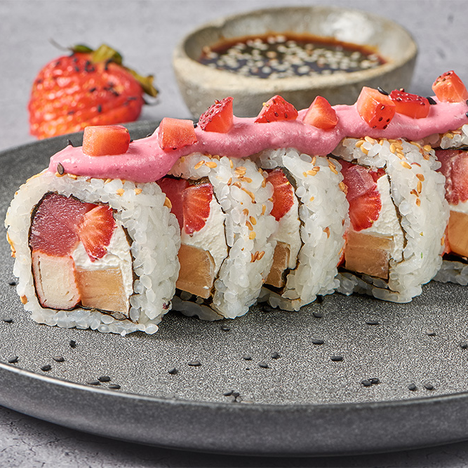 Atún fresco, queso philadelphia, fresa, canikama y yacón. Acompañado con salsa de queso y mora.