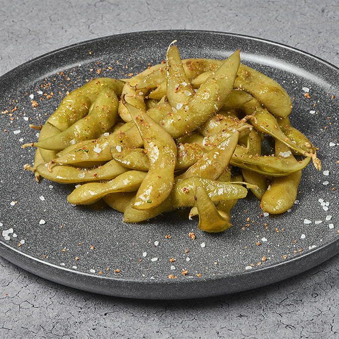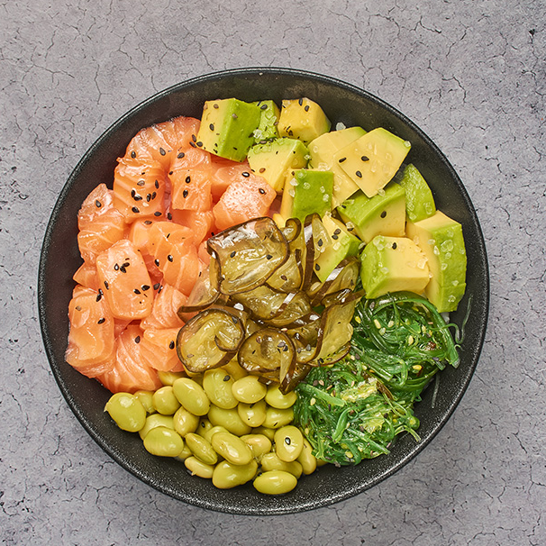 Arroz de sushi, salmón fresco, ensalada de alga, aguacate, pepino encurtido, y edamames. Acompañado con salsa miel de chile y vinagreta ponzu.