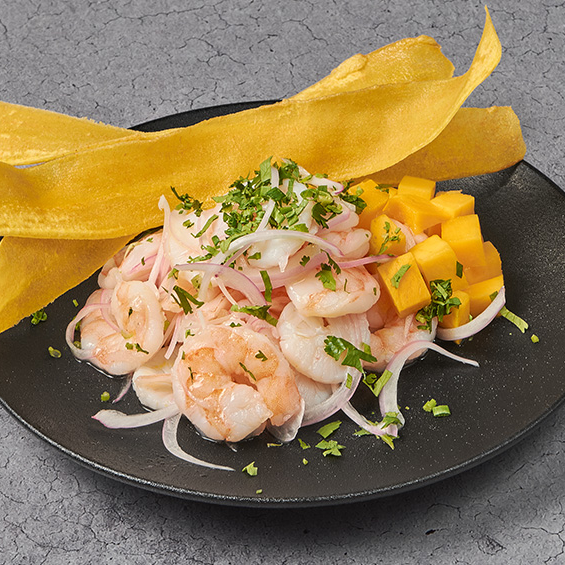 Delicioso ceviche clasico con 16 camarones, mango, cebolla, cilantro, jugo de limón y tajín. Acompañado con crocante de platano.