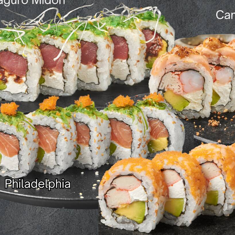 5 bocados philadelphia, 5 bocados maguro midori, 5 bocados california y 5 bocados camarón clasic. salsa de soya y salsa miel de chile
