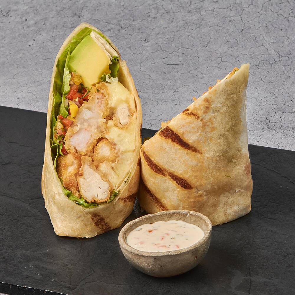 Relleno con camarón y pollo apanado, queso mozarella, aguacate, lechuga y pico de gallo. Acompañado con salsa acevichada y chile dulce.