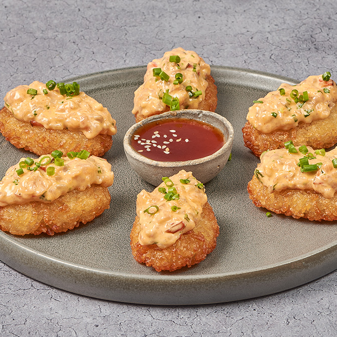 6 Croquetas de arroz cubiertas con un delicioso tartar de salmón.