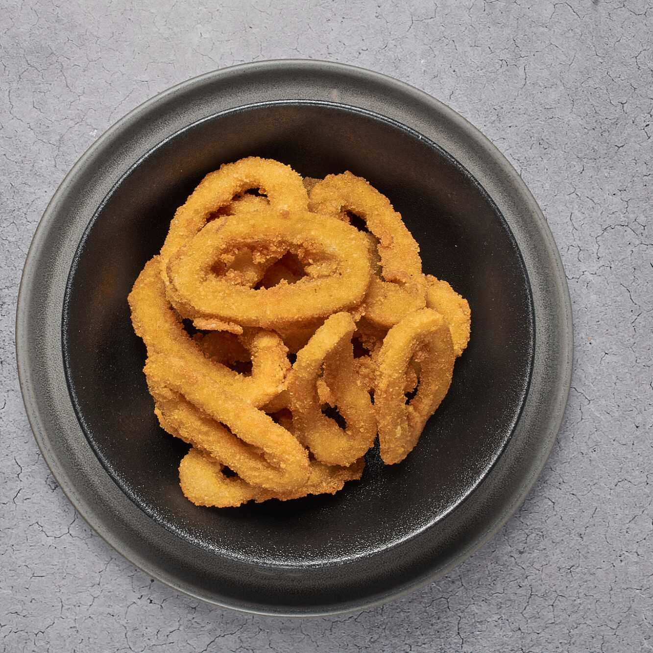 12 Aros de calamar apanados. Acompañados con salsa de chile dulce.