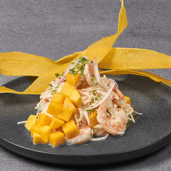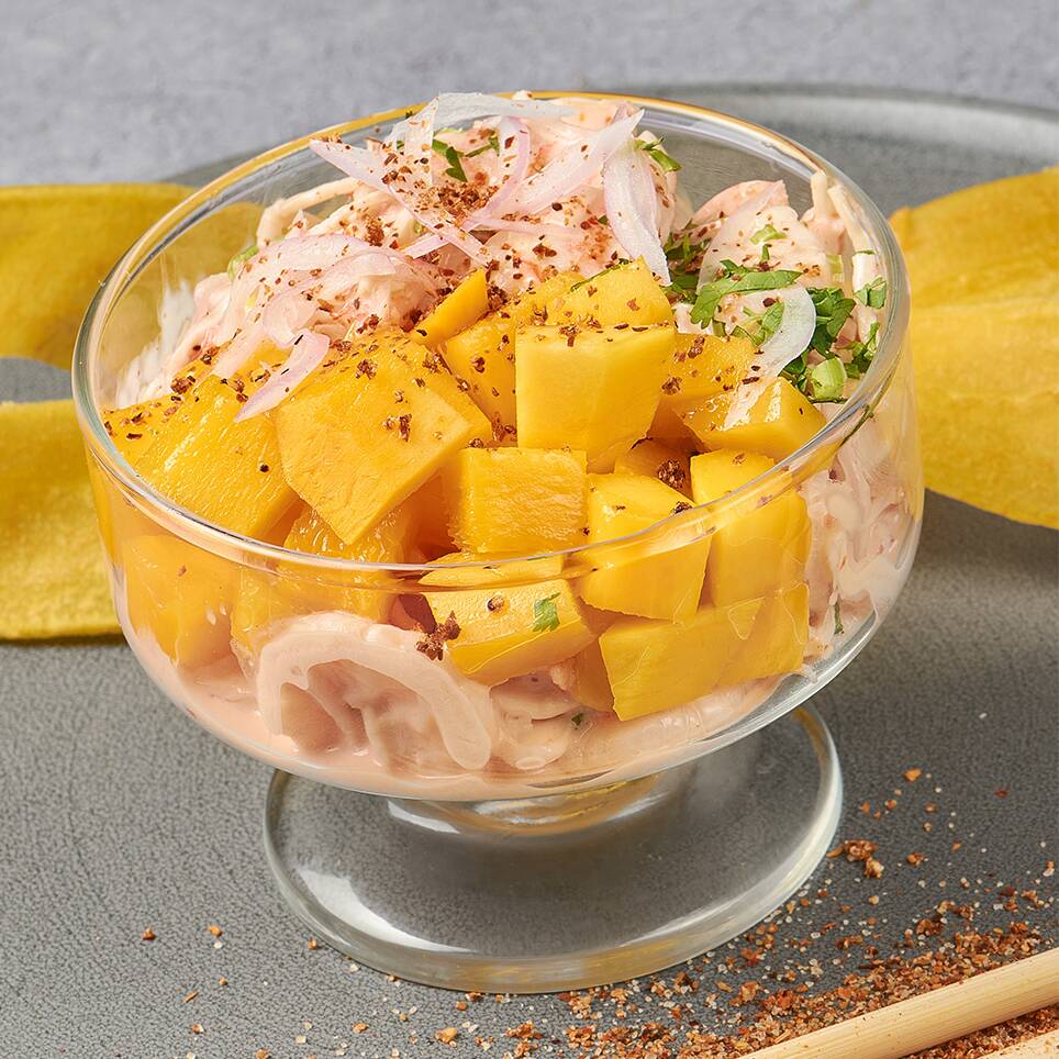 Cremoso cóctel con 10 camarones y 2 palmitos de cangrejo, cebolla, cilantro, mango, mayonesa, salsa de tomate, aceite de ajonjolí y tajín.