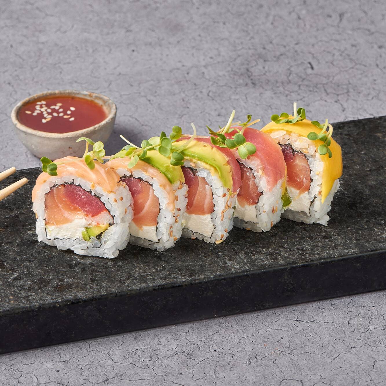 Relleno de salmón, atún, kanikama, aguacate y queso philadelphia. cubierto con salmón, atún, aguacate y mango. Acompañado con salsa miel de chile.