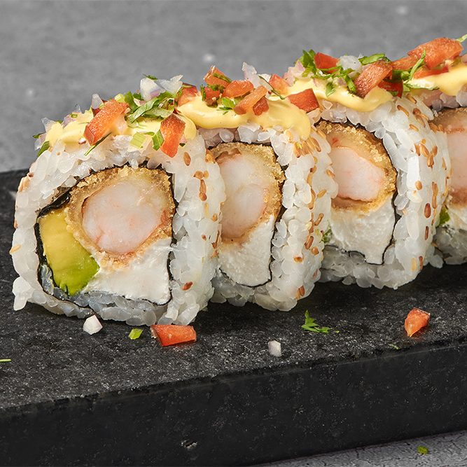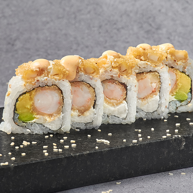 Langostino apanado, queso philadelphia, aguacate, cubierto con calamar apanado. Acompañado con salsa de mayonesa tradicional, sirasha y queso.