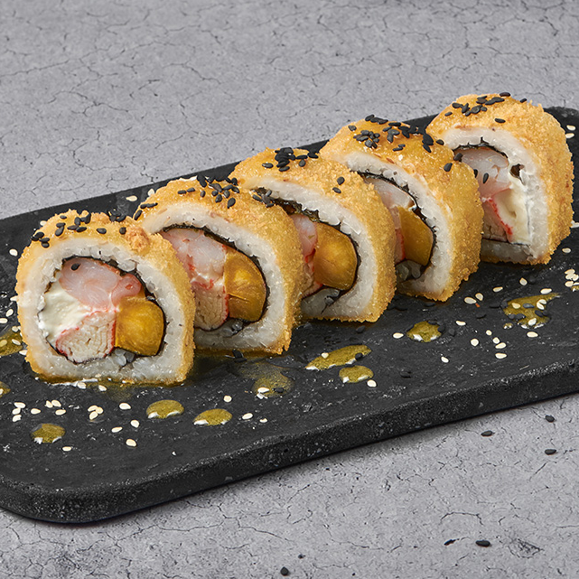 Sushi apanado, relleno de camarón, kanikama, platano maduro y queso philadelphia. Acompañado con salsa de maracuyá.