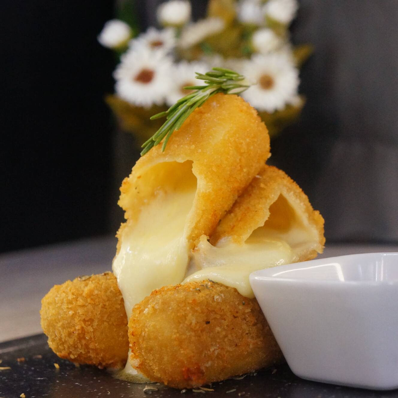 3 Palmito de cangrejo relleno con queso mozzarella. Acompañado con salsa de mora.